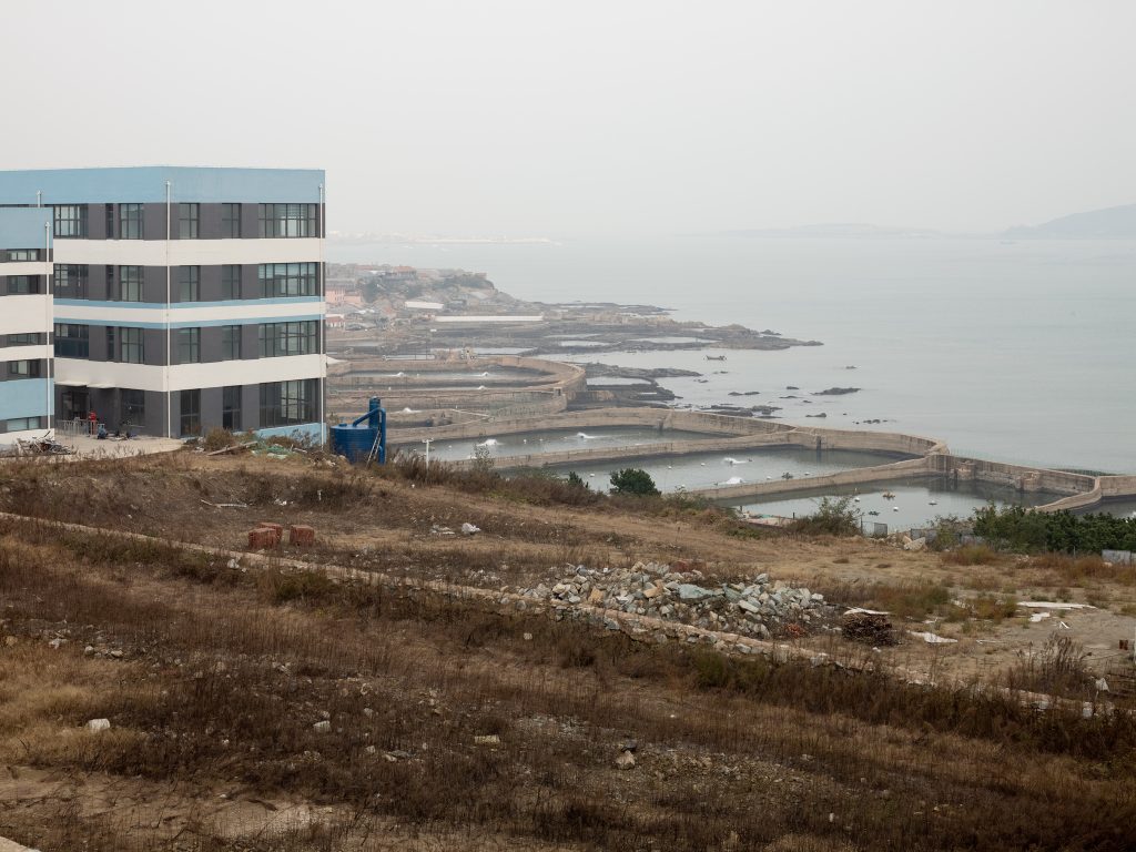 赵起超:刚才青岛那几张黑白是彩色的转的,钱塘江不是,钱塘江都是用黑白120胶卷拍的,青岛往边缘地区走一走,还能看到很多这种养殖的地方,这个楼是现代化的养殖工厂,远处是传统的养殖场。