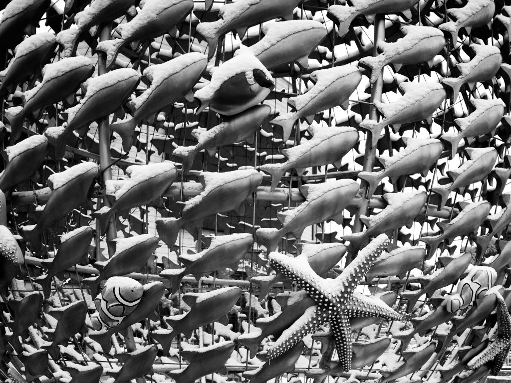 之所以这本画书大家比较喜欢原因是什么呢?就是我几百张里头只选了三十几张。今天青岛下雪,我出去拍了五十多张,所以说多拍,在青岛我有这个优势啊,就在我家门口啊,所以说我没事就出去拍呀,所以我青岛拍的就特别多,其实我建议大家多拍拍身边还是有好处的。因为拍身边你就可以拍的很深入。你今天不行,可以明天再去嘛,可以后天再去嘛,每次去可能都会有新的发现。好,那我就先放几张今天拍的呃,这三张片子是今天拍的啊,本来是彩色的,但是我闲着没事把它转成黑白的了。