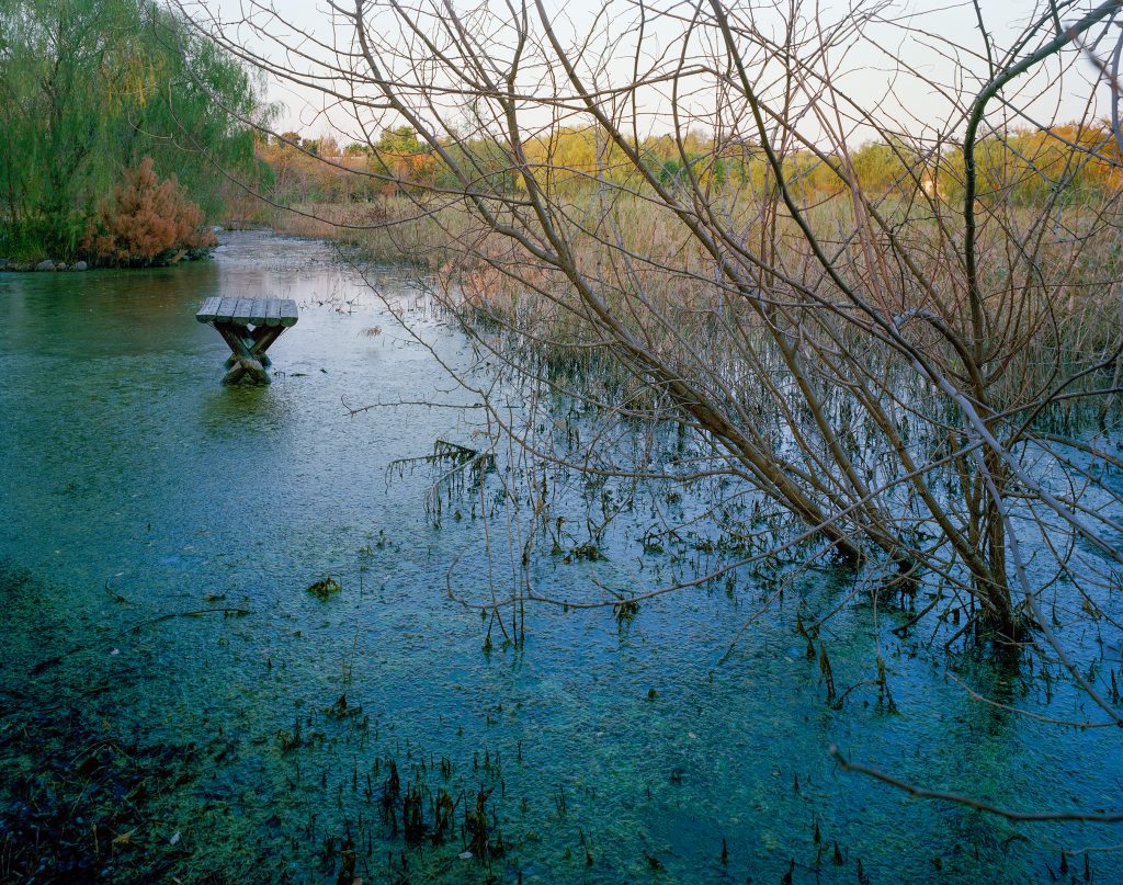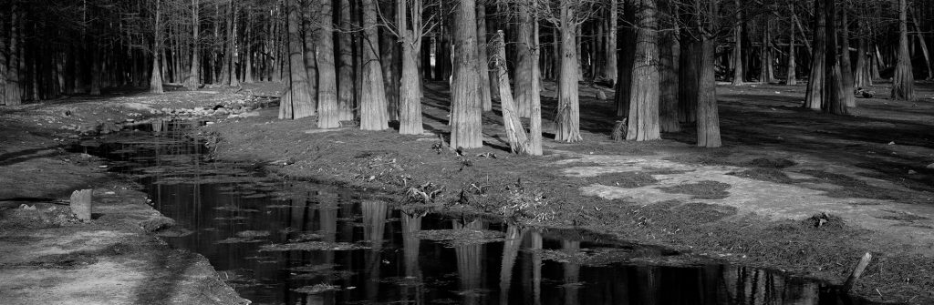 这是一个在冬季干枯的水库。夏天我来过这里,可惜没带相机,夏季的水库水位上涨,水杉林被水面包围,白鹭在此栖息,数量众多,在岸边鸟鸣不断,仿佛一场白色仪式的参与者。然而水面不知道什么原因漂浮着很多白鹭的尸体,死亡同样在场,像被时间遗忘的符号,与活着的群体形成静默的对照。这种生与死的共存,不是戏剧性的冲突,而是一种被自然接受的并列状态,像未被清理的历史遗迹,留在当下的景观之中,遗憾的是冬季没能拍到这一景观。冬季水位下降,土地重新显露,曾经淹没的区域变成可以徒步的滩地。水杉的根系裸露,像从时间深处翻出的旧档案,记录着水位变化、生态演替,也记录着人类干预的痕迹。成为季节更替的标记,也是一种被自然回收的“遗迹摄影”对象。此刻,景观不再是纯粹的“自然”,而是被历史、生态、人类活动共同书写的复合文本。