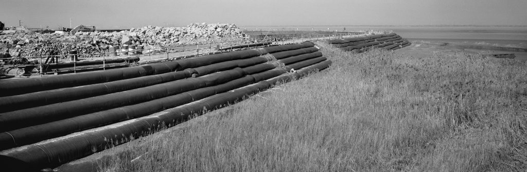 我查过资料,钱塘江流域城市的形成都是围垦而来的,甚至包括西湖过去都和钱塘江是连在一起的,被围垦逐渐隔离开来,围垦一直是钱塘江流域发展的基础,画面里那条黑色的像管道一样的东西就是围垦用的材料,是什么材质我不清楚,大概里面应该是沙土吧,这些新筑起的条形围垦带就是“当下”,是已经被编号、丈量,准备变成的建设用地。履带齿痕叠压在千年沉积层上,机械一夜的轨迹盖过了潮汐数百年的痕迹。延着围垦边界的围栏就像是标点符号,把古老的“沧海变桑田”叙事强行换行,宣告接下来的故事由工程图接笔。照片把两种时间压缩在同一帧:自然沉积的慢时间被人工干预的快时间瞬间覆盖,过去的水文地理与当下的围垦意志在画面对半而治,交接尚未完成,但胜负已见