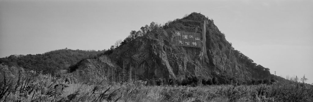这两张照片在画册中选用的是第一张照片,从表面看这两张照片都是孤山,构图也没有什么大的区别,但为什么选第一张,而没有选第二张呢,第二张照片的范式应该说也是不错的,但第一张山上的“渔浦江山天下稀”几个大字是关键,这是南宋诗人陆游写的,拍摄这张照片是偶然的,我当时驾车过浦阳江大桥,眼前一座孤山扑入我的眼帘,在江边显得很是突兀,仿佛被刀削过一样。下桥绕路折返,寻找到了一个可以停车的位置,背起相机,步行一段小路,寻了一个我认最佳的位置,支好三脚架,架起相机,拍摄了这幅照片,裸露的岩壁,分明的折线,山上还布满了星点反光,和当地朋友聊过后才知道那是绿化用的银色反光滴灌带,在阳光下闪烁。山腰凿着陆游的七个大字:“渔浦江山天下稀”与滴灌带形成鲜明对比,真是古人赞天然,今人靠输液;诗意大字与人工“打点滴”同框,怎么看都像一句冷幽默。
